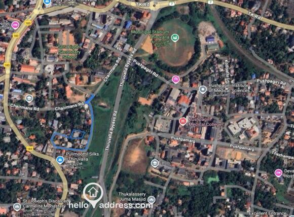 The property can be reached via a single road approach (marked in Red) from MC Road, or a longer route through Chairmans Road (marked in Blue). It is separated from the Thiruvalla Bypass by another property, and is the last house on the left from the single road approach as indicated on the pictures.
